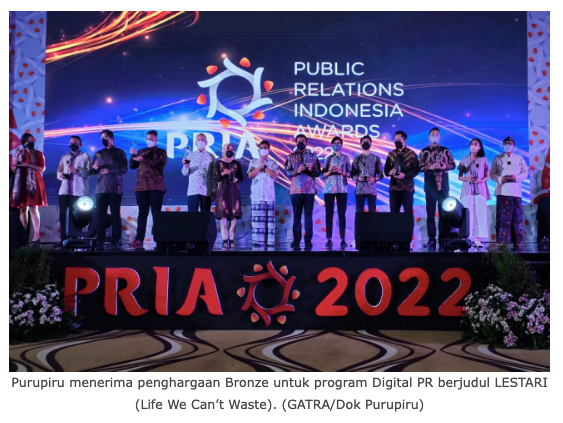 Jakarta, Gatra.com- Konsultan Public Relations Purupiru mendapatkan penghargaan PR INDONESIA AWARDS (PRIA) 2022. Purupiru menerima penghargaan Bronze untuk program Digital PR berjudul LESTARI (Life We Can’t Waste).